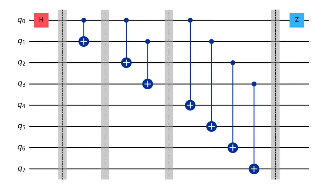 It is necessary to apply the technique learned in Problem A4, which is to avoid applying quantum gates consecutively to the same qubit as much as possible. Let's examine the following example with 8 qubits.